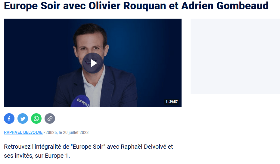 Europe 1, jeudi 20 juillet, 18h10 Écoutez l’émission Partager : Cliquer pour partager sur X(ouvre dans une nouvelle fenêtre) X Cliquez pour partager sur Facebook(ouvre dans une nouvelle fenêtre) Facebook Cliquez pour partager sur LinkedIn(ouvre dans une nouvelle fenêtre) LinkedIn J’aime chargement… Similaire