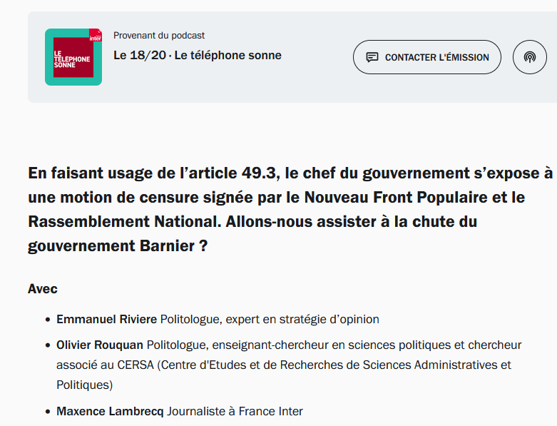 France inter, 03 déc. 2024, 19h20 Écoutez l’émission Partager : Cliquer pour partager sur X(ouvre dans une nouvelle fenêtre) X Cliquez pour partager sur Facebook(ouvre dans une nouvelle fenêtre) Facebook Cliquez pour partager sur LinkedIn(ouvre dans une nouvelle fenêtre) LinkedIn J’aime chargement… Similaire