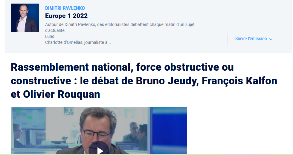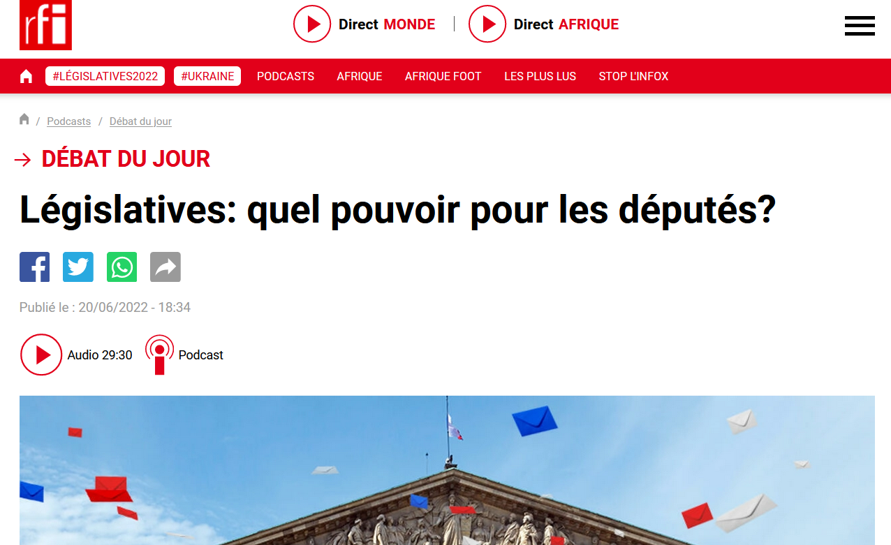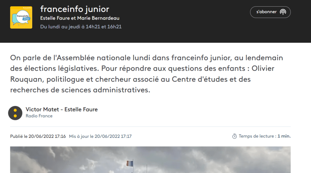 Publié le 21 juin 202221 juin 2022 par Olivier Rouquan Législatives : 2nd tour… et après ? @europe1, matinale, 21 juin 2022, 8h20, débat Ecoutez l’émission @rfi, 20 juin 2022, 19h10 Ecoutez l’émission @franceinfo, 20 juin 2026, france info junior Ecoutez l’émission @francebleu, 20 juin 2026, 12h Ecoutez l’émission Les résultats, @publicsenat, 20 juin 2022, 7h30 Regardez l’émission