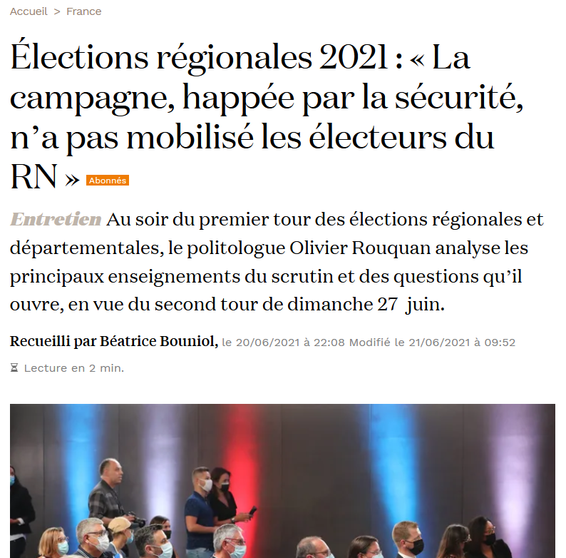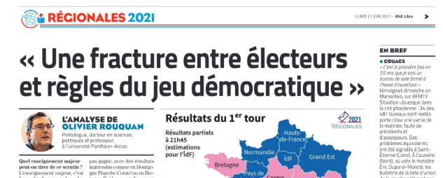Publié le 21 juin 202129 juin 2021 par Olivier Rouquan #régionales 2021 : résultats 1er tour – analyses Matinale @LCI 🗣️#7h50LeDebat🎙️Abstention : "C'est l'occasion pour les acteurs politiques de recentrer la campagne sur les enjeux liés à ces collectivités. Ça serait peut-être un moyen de motiver les électeurs."⬇️@orouquan était en direct dans la Matinale sur LCI @PascaledeLaTour pic.twitter.com/BZ77jrDxle— Le 6/9 (@LaMatinaleLCI) June 21, 2021 Midi Libre, Dépêcher du Midi, L’indépendant, 21/06/2021 ml-itw-olivier-rouquan-20.06.21Télécharger interview dans La Croix Lire l’interview Lire l’article